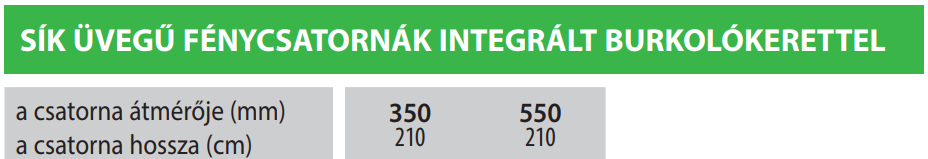 Körülbelül 10%-kal magasabb U hõátbocsátási érték a kupolás verzióhoz képest. Integrált burkolókeret a gyorsabb beépítés érdekében. A fénycsatorna sík, integrált burkolókerettel szerelt bevilágító felületbõl, 2,1 méter hosszú fénytovábbító csõbõl, mennyezeti keretbõl és fényelosztó prizmából áll.